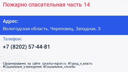 Пожарно-спасательная часть №14 по адресу Вологодская область, Череповец, Западная, 3 в дальнейшем Организация, размещена в следующих категориях: