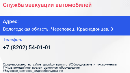 Служба эвакуации автомобилей по адресу Вологодская область, Череповец, Краснодонцев, 3 в дальнейшем Организация, размещена в следующих категориях: