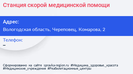 Станция скорой медицинской помощи по адресу Вологодская область, Череповец, Комарова, 2 в дальнейшем Организация, размещена в следующих категориях: