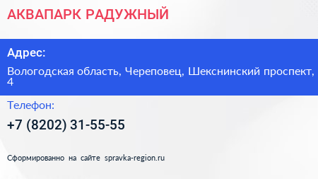 АКВАПАРК РАДУЖНЫЙ по адресу Вологодская область, Череповец, Шекснинский проспект, 4 в дальнейшем Организация, размещена в следующих категориях: