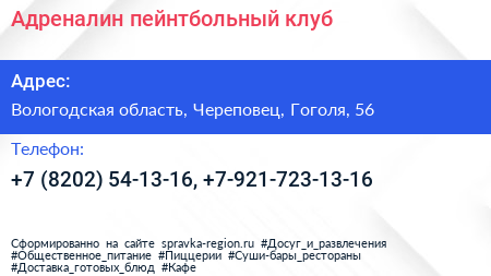 Адреналин, пейнтбольный клуб по адресу Вологодская область, Череповец, Гоголя, 56 в дальнейшем Организация, размещена в следующих категориях:
