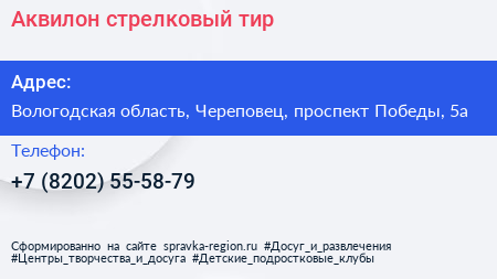 Аквилон, стрелковый тир по адресу Вологодская область, Череповец, проспект Победы, 5а в дальнейшем Организация, размещена в следующих категориях: