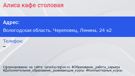Алиса, кафе-столовая по адресу Вологодская область, Череповец, Ленина, 24 к2 в дальнейшем Организация, размещена в следующих категориях: