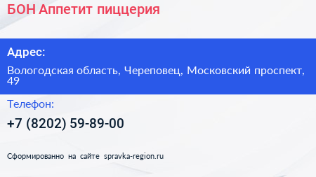 БОН Аппетит, пиццерия по адресу Вологодская область, Череповец, Московский проспект, 49 в дальнейшем Организация, размещена в следующих категориях: