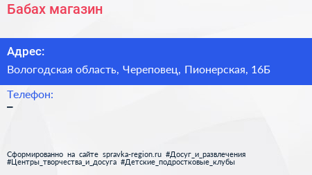 Бабах, магазин по адресу Вологодская область, Череповец, Пионерская, 16Б в дальнейшем Организация, размещена в следующих категориях: