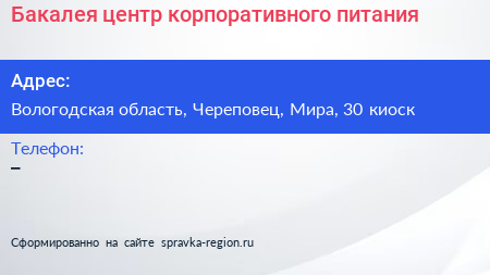 Бакалея, центр корпоративного питания по адресу Вологодская область, Череповец, Мира, 30 киоск в дальнейшем Организация, размещена в следующих категориях: