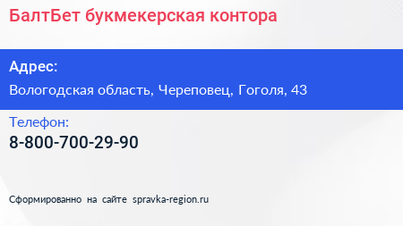 БалтБет, букмекерская контора по адресу Вологодская область, Череповец, Гоголя, 43 в дальнейшем Организация, размещена в следующих категориях: