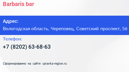 Barbaris bar по адресу Вологодская область, Череповец, Советский проспект, 56 в дальнейшем Организация, размещена в следующих категориях: