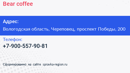 Bear coffee по адресу Вологодская область, Череповец, проспект Победы, 200 в дальнейшем Организация, размещена в следующих категориях: