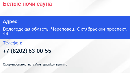 Белые ночи, сауна по адресу Вологодская область, Череповец, Октябрьский проспект, 48 в дальнейшем Организация, размещена в следующих категориях:
