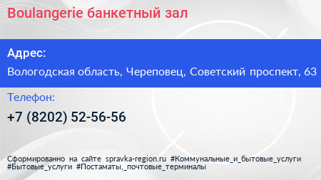 Boulangerie, банкетный зал по адресу Вологодская область, Череповец, Советский проспект, 63 в дальнейшем Организация, размещена в следующих категориях: