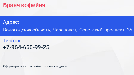 Бранч, кофейня по адресу Вологодская область, Череповец, Советский проспект, 35 в дальнейшем Организация, размещена в следующих категориях: