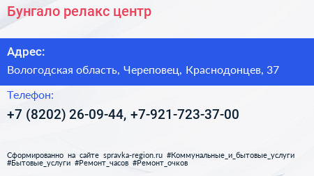 Бунгало, релакс-центр по адресу Вологодская область, Череповец, Краснодонцев, 37 в дальнейшем Организация, размещена в следующих категориях:
