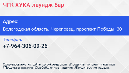 ЧГК ХУКА, лаундж-бар по адресу Вологодская область, Череповец, проспект Победы, 30 в дальнейшем Организация, размещена в следующих категориях: