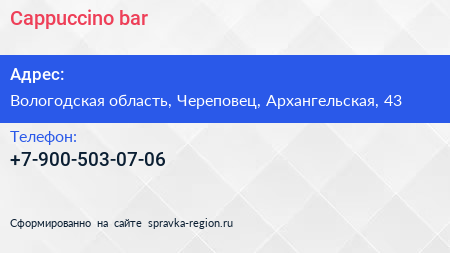 Cappuccino bar по адресу Вологодская область, Череповец, Архангельская, 43 в дальнейшем Организация, размещена в следующих категориях: