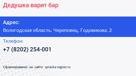 Дедушка варит, бар по адресу Вологодская область, Череповец, Годовикова, 2 в дальнейшем Организация, размещена в следующих категориях: