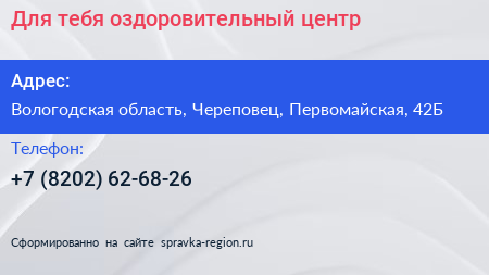 Для тебя, оздоровительный центр по адресу Вологодская область, Череповец, Первомайская, 42Б в дальнейшем Организация, размещена в следующих категориях: