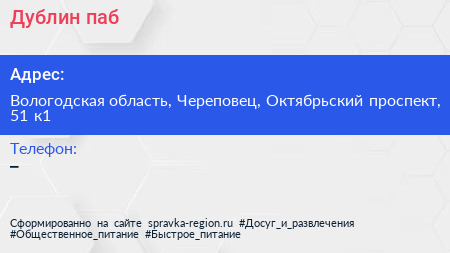 Дублин, паб по адресу Вологодская область, Череповец, Октябрьский проспект, 51 к1 в дальнейшем Организация, размещена в следующих категориях: