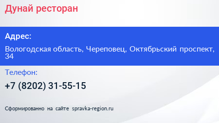 Дунай, ресторан по адресу Вологодская область, Череповец, Октябрьский проспект, 34 в дальнейшем Организация, размещена в следующих категориях: