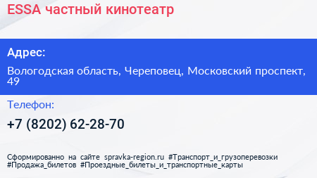ESSA, частный кинотеатр по адресу Вологодская область, Череповец, Московский проспект, 49 в дальнейшем Организация, размещена в следующих категориях: