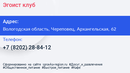Эгоист, клуб по адресу Вологодская область, Череповец, Архангельская, 62 в дальнейшем Организация, размещена в следующих категориях: