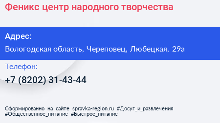 Феникс, центр народного творчества по адресу Вологодская область, Череповец, Любецкая, 29а в дальнейшем Организация, размещена в следующих категориях:
