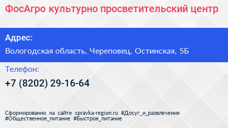 ФосАгро, культурно-просветительский центр по адресу Вологодская область, Череповец, Остинская, 5Б в дальнейшем Организация, размещена в следующих категориях: