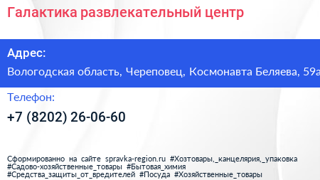 Галактика, развлекательный центр по адресу Вологодская область, Череповец, Космонавта Беляева, 59а в дальнейшем Организация, размещена в следующих категориях: