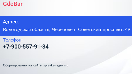 GdeBar по адресу Вологодская область, Череповец, Советский проспект, 49 в дальнейшем Организация, размещена в следующих категориях: