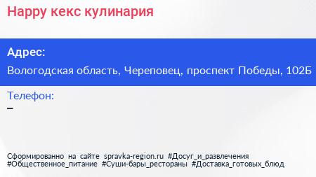 Happy кекс, кулинария по адресу Вологодская область, Череповец, проспект Победы, 102Б в дальнейшем Организация, размещена в следующих категориях: