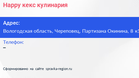 Happy кекс, кулинария по адресу Вологодская область, Череповец, Партизана Окинина, 8 к1 в дальнейшем Организация, размещена в следующих категориях: