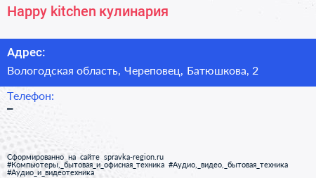 Happy kitchen, кулинария по адресу Вологодская область, Череповец, Батюшкова, 2 в дальнейшем Организация, размещена в следующих категориях: