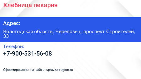 Хлебница, пекарня по адресу Вологодская область, Череповец, проспект Строителей, 33 в дальнейшем Организация, размещена в следующих категориях: