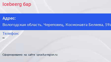 Icebeerg, бар по адресу Вологодская область, Череповец, Космонавта Беляева, 59а в дальнейшем Организация, размещена в следующих категориях: