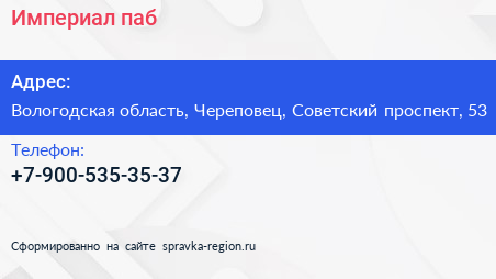 Империал, паб по адресу Вологодская область, Череповец, Советский проспект, 53 в дальнейшем Организация, размещена в следующих категориях: