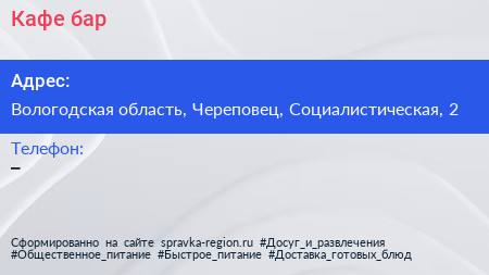 Кафе-бар по адресу Вологодская область, Череповец, Социалистическая, 2 в дальнейшем Организация, размещена в следующих категориях: