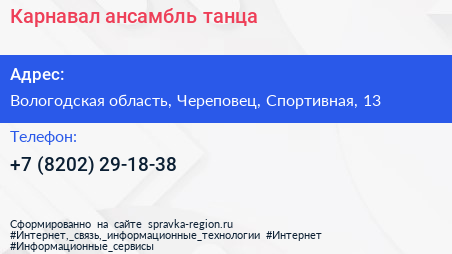Карнавал, ансамбль танца по адресу Вологодская область, Череповец, Спортивная, 13 в дальнейшем Организация, размещена в следующих категориях:
