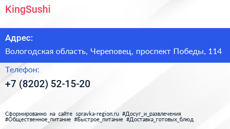 KingSushi по адресу Вологодская область, Череповец, проспект Победы, 114 в дальнейшем Организация, размещена в следующих категориях: