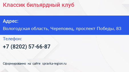 Классик, бильярдный клуб по адресу Вологодская область, Череповец, проспект Победы, 83 в дальнейшем Организация, размещена в следующих категориях: