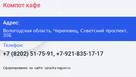 Компот, кафе по адресу Вологодская область, Череповец, Советский проспект, 35Б в дальнейшем Организация, размещена в следующих категориях: