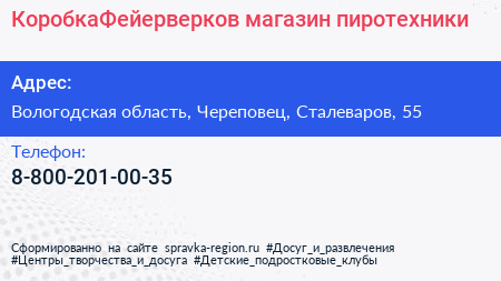 КоробкаФейерверков, магазин пиротехники по адресу Вологодская область, Череповец, Сталеваров, 55 в дальнейшем Организация, размещена в следующих категориях: