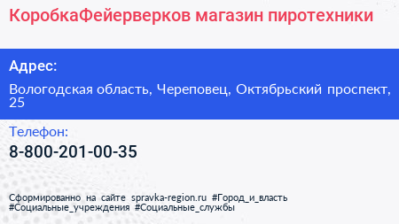 КоробкаФейерверков, магазин пиротехники по адресу Вологодская область, Череповец, Октябрьский проспект, 25 в дальнейшем Организация, размещена в следующих категориях: