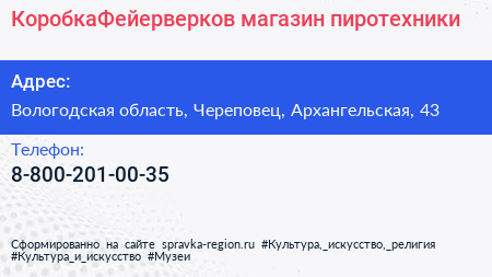 КоробкаФейерверков, магазин пиротехники по адресу Вологодская область, Череповец, Архангельская, 43 в дальнейшем Организация, размещена в следующих категориях:
