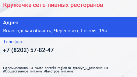 Кружечка, сеть пивных ресторанов по адресу Вологодская область, Череповец, Гоголя, 19а в дальнейшем Организация, размещена в следующих категориях: