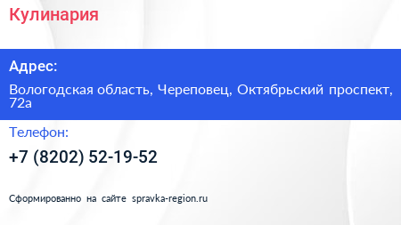 Кулинария по адресу Вологодская область, Череповец, Октябрьский проспект, 72а в дальнейшем Организация, размещена в следующих категориях: