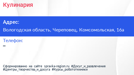 Кулинария по адресу Вологодская область, Череповец, Комсомольская, 16а в дальнейшем Организация, размещена в следующих категориях: