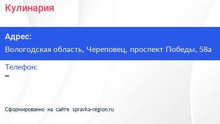 Кулинария по адресу Вологодская область, Череповец, проспект Победы, 58а в дальнейшем Организация, размещена в следующих категориях:
