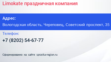 Limokate, праздничная компания по адресу Вологодская область, Череповец, Советский проспект, 35 в дальнейшем Организация, размещена в следующих категориях:
