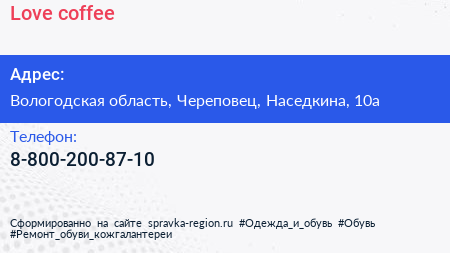 Love coffee по адресу Вологодская область, Череповец, Наседкина, 10а в дальнейшем Организация, размещена в следующих категориях: