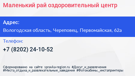 Маленький рай, оздоровительный центр по адресу Вологодская область, Череповец, Первомайская, 62а в дальнейшем Организация, размещена в следующих категориях:
